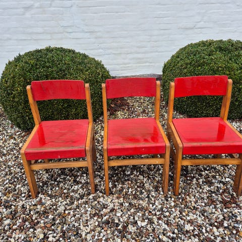 Søde børnestole sælges samlet til 100 kr for to stole. De er af ældre dato, og derfor med en del patina, men kan slibes ned og males (det har vi aldrig fået gjort).