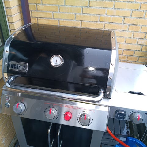 Weber Spirit gasgrill med 4 brændere i sort kabinet. Grillen har låg med indbygget termometer og grillriste i metal. Der er sidebord i metal på den ene side til afsætning af grillredskaber eller mad. Velegnet til udendørs madlavning på terrasse eller altan, hvor der ønskes en gasdrevet grill med flere brændere til samtidig tilberedning af forskellige retter.