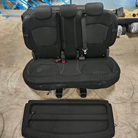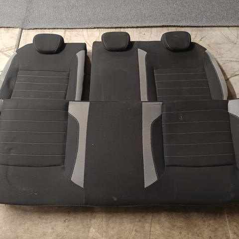Bagsæde til bil i mørkt stof. Sædet fremstår som en komplet bagsædeenhed med tre siddepladser, integrerede nakkestøtter og midterarmlæn. Overfladen er i tekstil med mønsterfelter og glatte felter. Velegnet som erstatning for eksisterende bagsæde i en kompatibel bilmodel, hvor der ønskes et mørkt stofsæde med tre pladser.