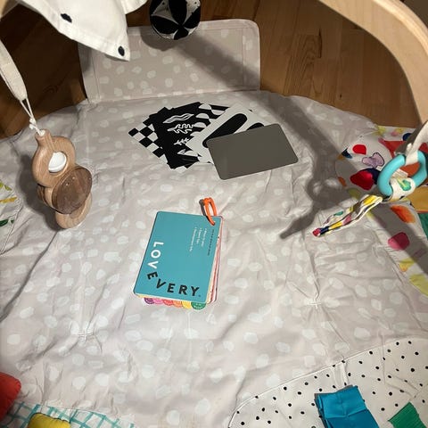 Der sælges kun måtte og træstativ. Man kan dog nemt hænge sit eget legetøj på og selv bestemme højden.