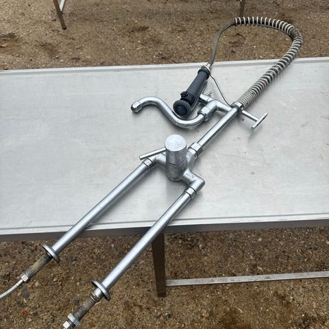 Industriel vandhane med bruser og fleksibel slange. Enheden består af en armaturdel med tud og reguleringsgreb samt en separat håndbruser forbundet med en fleksibel metalspiralslange. Velegnet til brug i eksempelvis grovkøkken, værksted eller andre steder, hvor der er behov for både fast vandstråle og håndholdt bruserfunktion.