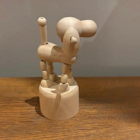 Sæt med to træfigurer formet som hunde i naturfarvet træ. Figurerne har bevægelige led i ben og hoved, så de kan stilles i forskellige positioner. Velegnet som dekoration i hjemmet eller på børneværelset. Fremstillet i massivt træ med udskårne detaljer som ører, snude og hale.