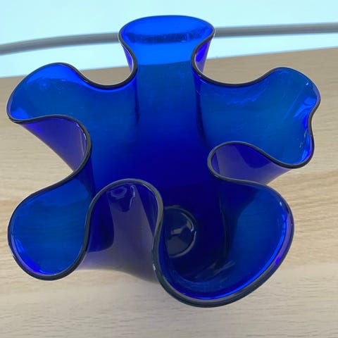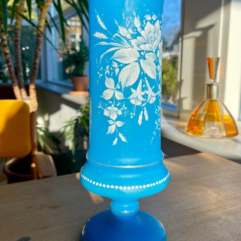 Dekorativ blå vase med detaljeret motiv af fugl i guld og blomster. Vasen har en blank overflade og en klassisk, slank form med lille fod. Egnet som pyntegenstand på bord, hylde eller vindueskarm, med eller uden blomster. Velegnet til indretning i stue, spisestue eller entré. Vasen er 26 cm. høj og en diameter på ca. 11 cm.