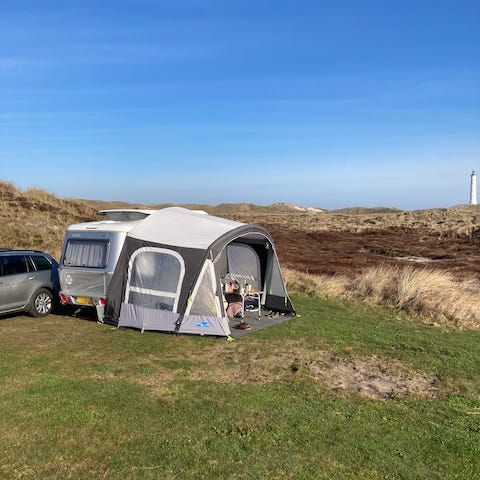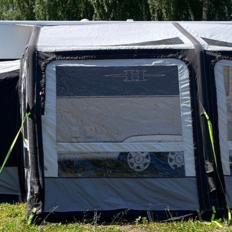 Der medfølger gardiner, manuel og elektrisk pumpe, termoloft, tæppe, stormbåndsæt, skørt stykke og støtte stænger til at lukke teltet helt tæt til vognen.