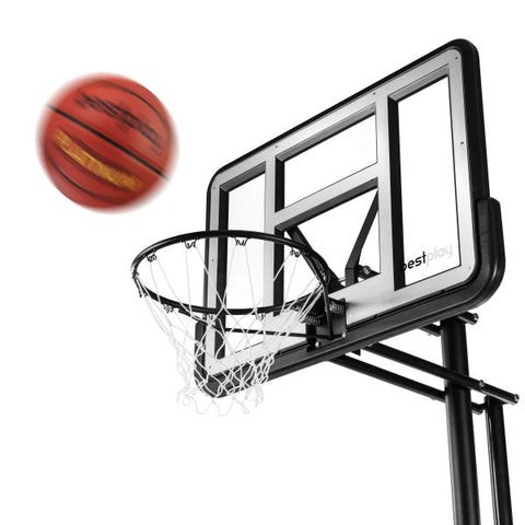Basketstander med rektangulært transparent plade og metalring. Standeren har justerbar højde via håndtag på stolpen. Nederst er der en transportabel fod i plast, som kan fyldes for at give stabilitet. Velegnet til udendørs brug på terrasse, indkørsel eller gårdsplads til fritidsspil og træning.