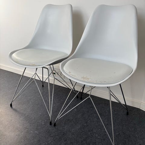 Sælger disse helt klassiske hvide stole. Nogle af dem har et par små skræmmer, men de fremstår fint. Kan fx bruges som ekstra-stole, hvis man har brug for det. Mener at vi har købt dem i Ilva.