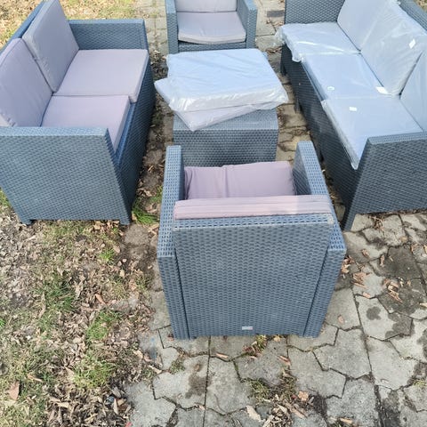 Havemøbelsæt loungemøbler i sort polyrattan. Sættet består af en 2-personers sofa, to loungestole og et rektangulært bord med glasplade. Møblerne er udført i flettet polyrattan i mørk farve, velegnet til brug i have, på terrasse eller altan. Bordet har opbevaringsplads under låget, som kan bruges til opbevaring af hynder eller mindre haveudstyr.