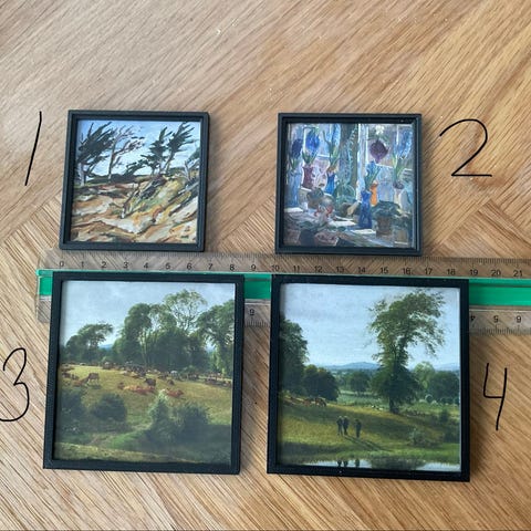 Lundby dukkehus billeder med landskabsmotiver. Sælges pris 25 kr pr stk. jeg sender køber betaler fragt, små firkantede billeder i sorte rammer med forskellige motiver: landsby med bro, vinterlandskab med hus samt bindingsværkshus i grønt landskab. Størrelsen fremgår af billederne med lineal og passer til brug i Lundby dukkehuset/ Nissebo eller andre dukkehuse i tilsvarende skala.