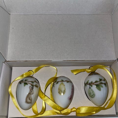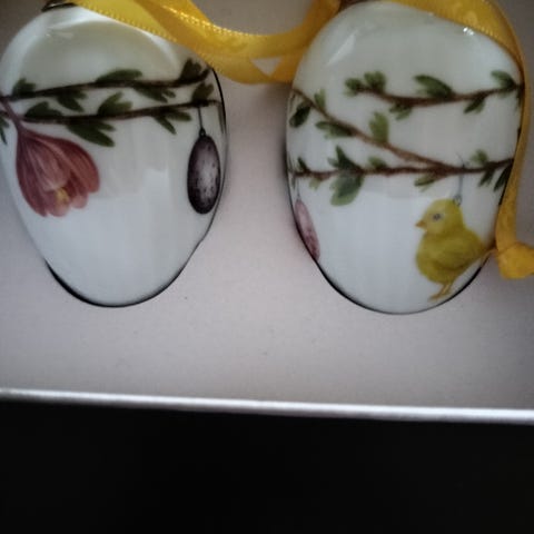 Kähler Hammershøi Easter påskeophæng i form af æg i hvidt porcelæn. Motiverne omfatter blandt andet en gren med fugl og en gren med blomst, og ophængene har gule bånd til ophængning. Velegnet som påskepynt til ophæng på grene, i vindue eller andre steder i hjemmet. Leveres i originale æsker, som ses på billederne