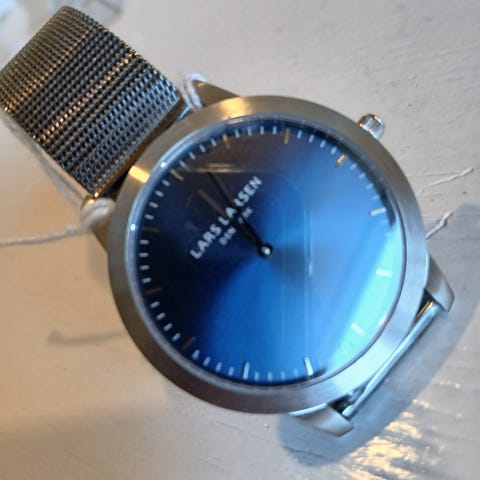 Lars Larsen herreur med rund blå urskive og markeringer uden tal. Uret har urkasse i metal med guldfarvet finish og sort læderrem med syninger langs kanten. Bagsiden af urkassen har indgraveret motiv og oplysninger om uret. Velegnet som klassisk armbåndsur til mænd til daglig brug eller mere formelle anledninger.