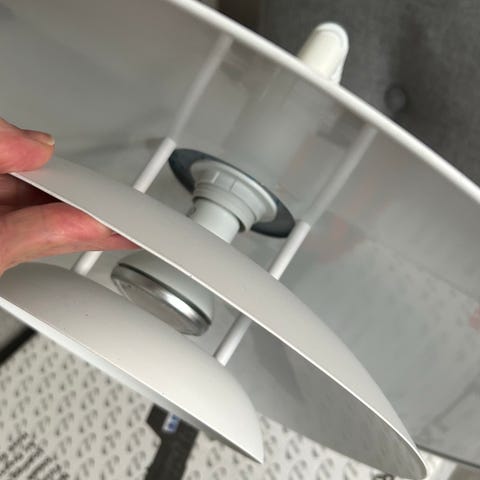 Flere skærme gør at lyskilden er skjult, den orangerøde skærm inders ved lyskilden gør at lampen altid givet et varmt og behageligt lys