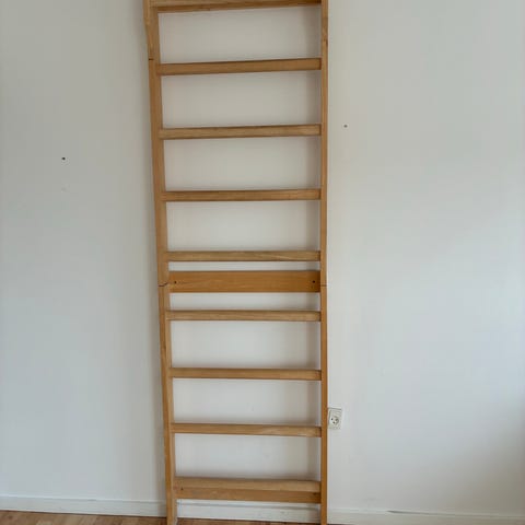 Ribbevæg i træ i naturfarvet udførsel. Velegnet til montering på væg til brug i hjemmet, træningsrum eller børneværelse. Består af lodrette sidestykker og flere tværgående ribber, som giver mulighed for forskellige øvelser og aktiviteter.