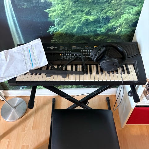 Gear4music K1 electronic keyboard med 61 tangenter i sort. Keyboardet kører via 5V USB-strøm eller 6 x AA-batterier. Modellen har indbyggede rytmer og lyde, som kan vælges via kontrolpanelet. Sælges med stativ, bænk og hovedtelefoner som vist på billederne, egnet til øvning derhjemme eller som begynderkeyboard.