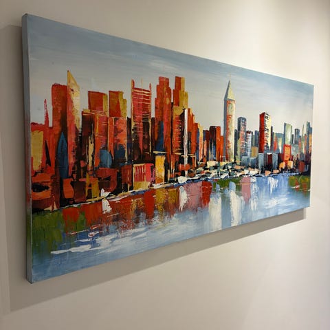 Maleri med bybillede udført i akryl på lærred. Motivet viser en livlig gade med bygninger, mennesker og biler i stærke, blandede farver. Maleriet har et moderne, impressionistisk udtryk og egner sig som vægdekoration i stue, kontor eller andre opholdsrum. 120x90