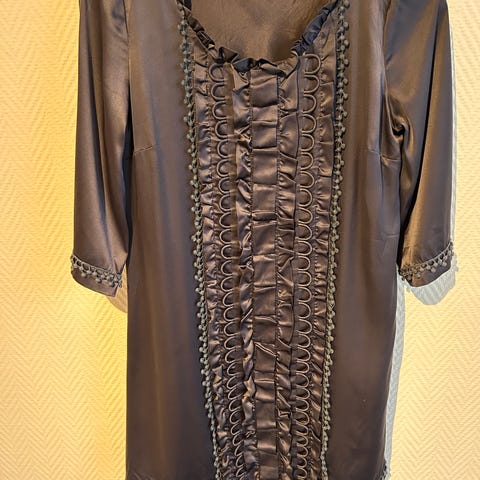 Flot sort silkekjole med dekorativ perledekoration på brystet. Købt for 600 kr.