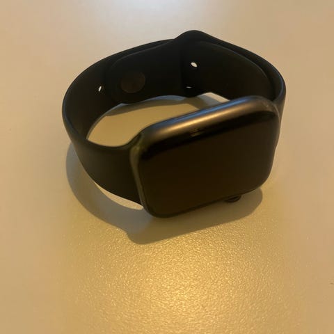 Apple Watch Series 6 smartwatch med 44mm urkasse i space gray aluminium og sort sportrem. Uret har rektangulær touchskærm og bagside med optiske sensorer til blandt andet puls- og aktivitetsmåling. Leveres med magnetisk opladerkabel som vist på billederne. Egnet til brug som aktivitetsur, notifikationsur og generel hverdagsbrug.