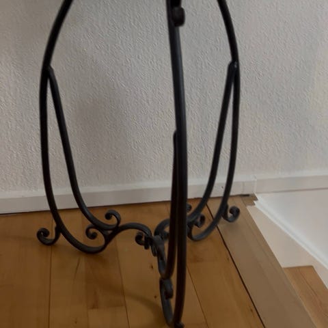 Gammelt bord i jern. Blomsterbord. Entrebord. Lille dekorativt metalbord. Pladen øverst er af træ.