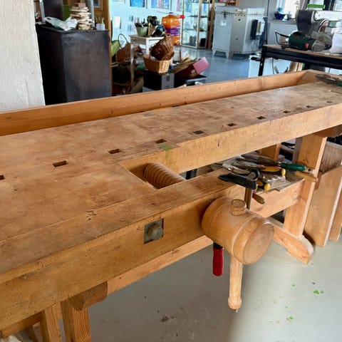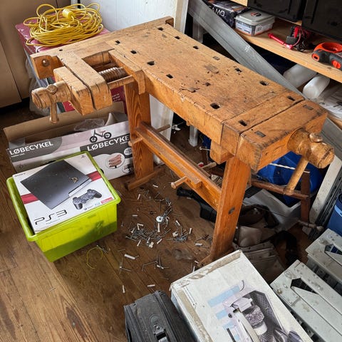 Gammel høvlbænk. Virker, men trænger til lidt kærlighed.