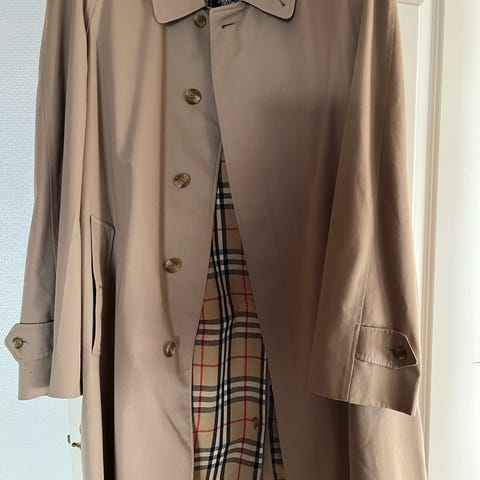 Burberry cardigan i str XXL , den er brugt med er i ok stand. Der er et lille stykke af foret, som sidder løst, (billede 4). Den er ny renset. Den er både lynsås og knapper