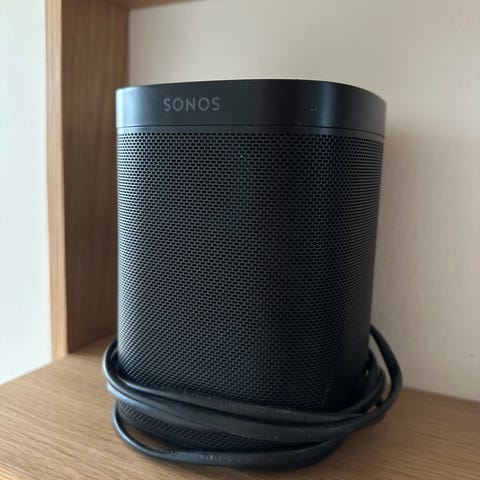 Sonos One trådløs højttaler i sort. Kompakt netværkshøjttaler med touch-knapper på toppen til styring af lyd. Højttaleren kan indgå i et multiroom-setup via Sonos-systemet og kan bruges enkeltvis eller som stereopar. Velegnet til brug i stue, køkken eller andre rum, hvor der ønskes trådløs afspilning via netværk og understøttede streamingtjenester.