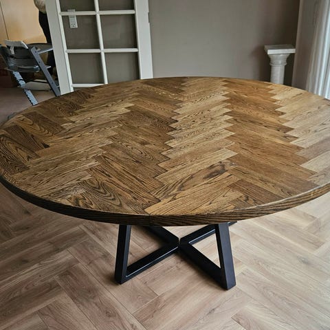 IKEA rundt spisebord i træ. Bordet har en rund bordplade i mørk træfinish med tydelig årestruktur og en stabil benkonstruktion. Designet af Anders Pehrson. Velegnet som spisebord i køkken eller spisestue med plads til flere stole omkring bordet.