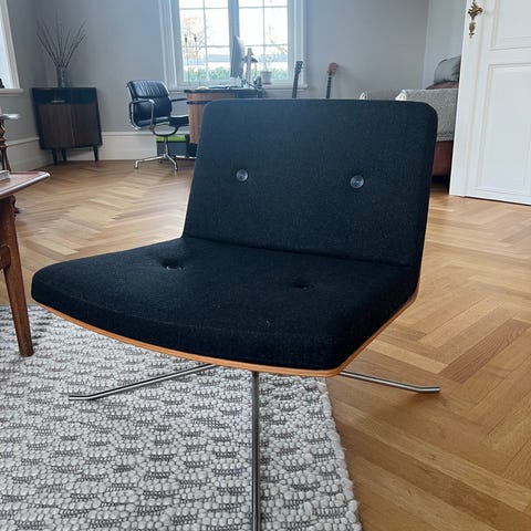 Bolia Loungestol med Fodskammel 🌸 mørkegrå stof og krom stel 🌸 pæn stand
