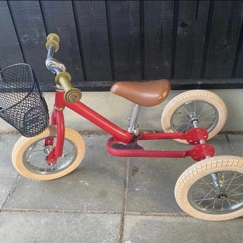Trehjulet cykel til børn med 10" hjul. Cyklen er i pink med hvide detaljer på dæk, sæde og styr. Modellen har et bredt sæde og et bagagebræt/bagkasse, der giver plads til at medbringe legetøj eller andre småting. Egnet som begynder- eller løbecykel til mindre børn, der skal øve balance og pedalkørsel på tre hjul.