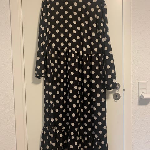 H&M hverdagskjole til damer i str. 38. Kjolen er sort og fremstillet i bomuld. Modellen har 3/4-ærmer og rund halsudskæring. Velegnet som enkel hverdagskjole.
