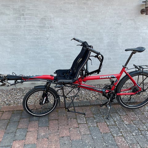 En skøn måde at komme rundt sammen. Bagerste person styrer og skifter gear (27 gear), forreste sidder/ligger behageligt og træder med, men kan også holde pause mens bagerste mand træder videre. Man har hovederne tæt på hinanden, hvilket gør samtale nemt. Afstand til forreste pedaler kan indstilles så både små og store kan køre med. Der er skivebremser for og bag og affjedring i forgaflen for god komfort. Der er ikke mange af disse på markedet og denne er “priced to sell”. Skal I køre sommeren i møde sammen?