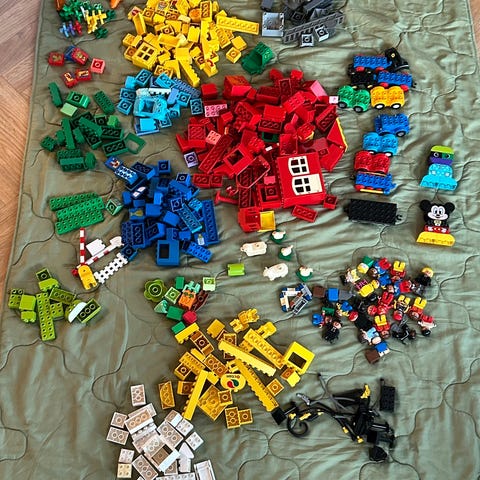 LEGO DUPLO klodser blandet lot i forskellige farver og former. Lot’et indeholder en blanding af standardklodser, specialklodser, køretøjsdele, dyr, mennesker og forskellige tilbehørsdele.
