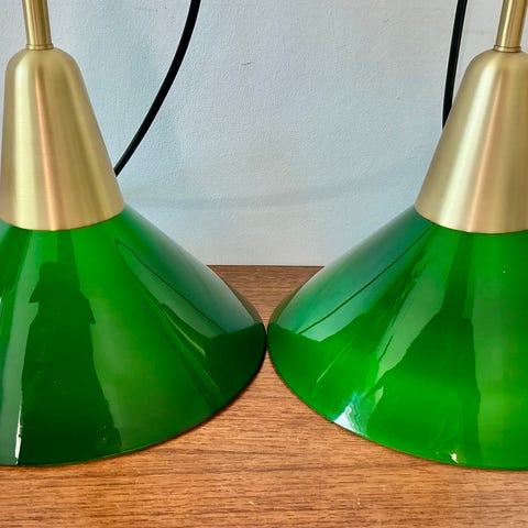 Pendel meget gammel med skærm af opalglas og fatning og ophæng af porcelæn 25,5 cm i diameter. 2 stk
