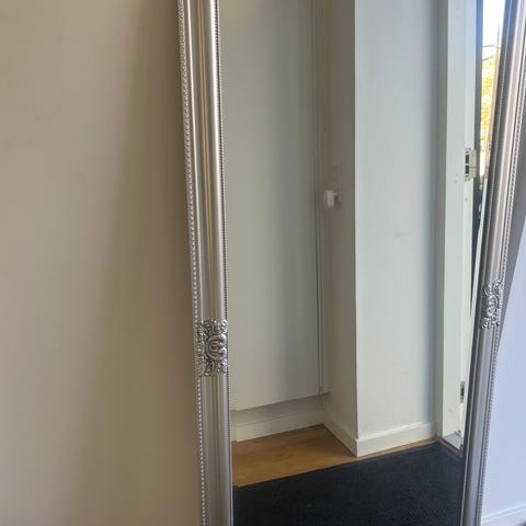 Flot spejl med sølvramme. Kan både stå på gulvet eller hænges på væggen.