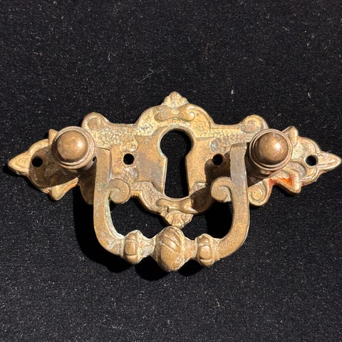 Skuffebeslag, Ved ikke, Flotte skuffebeslag i messing. Medfølgende små skruer. Vintage. To fotos af æskehængsler er ikke med i annoncen. Fejl taget med :-)