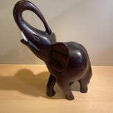 Dette er en håndskåret elefantfigur i mørkt træ, ofte fundet som et dekorativt samleobjekt eller retro-interiør.