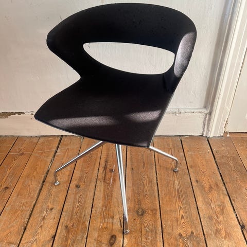 Design stol med armlæn i grå velour polstring. Stolen har blød, stofbetrukket skal med integrerede armlæn og let buet ryg for støtte. Sædet er polstret for øget komfort. Ben i mørkt træ eller metal med let skrå udformning giver stolen et stabilt udtryk. Velegnet som spisebordsstol, kontorstol eller loungestol i stue, køkken eller kontor.