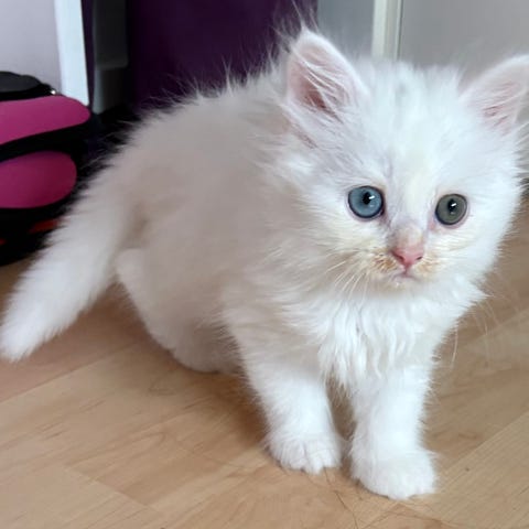 Sød lille hvid han killing med de smukkeste blå øjne. Han ligner sin far meget.