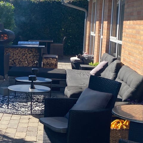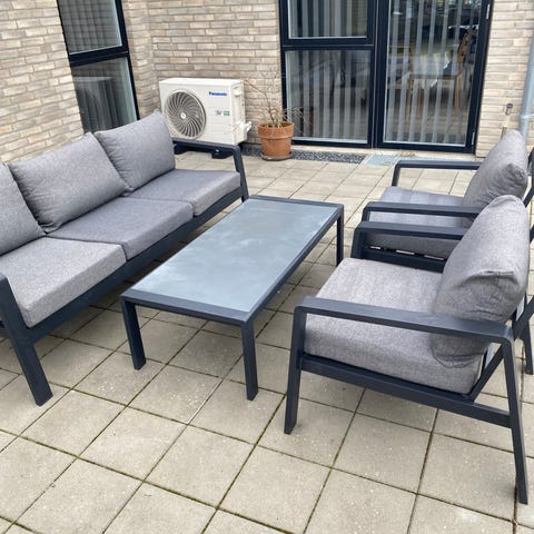 Jeg sælger sættet her med to stole, en sofa og bord. Den ene stol har lidt misfarvning på stykket man sidder på efter en rusten kæde, det er aldrig prøvet fjernet. Ellers fejler det ingenting.