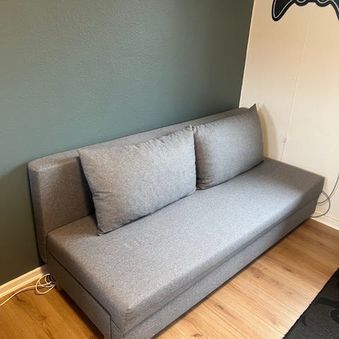 IKEA sovesofa i mørkegråt stof. Sofaen kan trækkes ud til en liggeflade og fungere som seng. Den har armlæn i begge sider og løse ryghynder. Under sædet er der opbevaringsplads, som kan bruges til fx sengetøj eller puder. Egnet til brug i stue, gæsteværelse eller mindre rum, hvor der er behov for både sofa og soveplads. Pent brugt, købt i August 2025. Se produktlenke. https://www.ikea.com/no/no/p/skoenabaeck-2-seters-sovesofa-knisa-mork-gra-70582542/