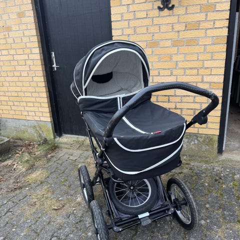 Brugt men stadig brugbar. Odder barnevogn i sort med liggedel. Vognen har klassisk stel med fire lufthjul og indkøbskurv under vognen. Justerbart styr og kaleche med mulighed for at slå den op og ned. Indvendigt ses madras og tekstiler i lyse nuancer. Egnet til transport og daglig brug med spædbarn eller mindre barn