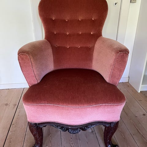 Polstret lænestol med udskåret træramme og broderet betræk. Særlig god siddekomfort. Stolen har buede ben og armlæn i lyst træ med udskårne detaljer. Sæde, ryg og armlæn er betrukket med blomsterbroderi i lyse og rosa nuancer. Undersiden viser traditionel fjedre- og remkonstruktion. Velegnet som lænestol eller pyntestol i stue, soveværelse eller entré.