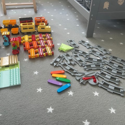 LEGO DUPLO togsæt med tal i flere farver. Sættet består af en togmaskine med vogne, klodser med tallene 0-9 samt figurer og tilbehør som vist på billederne. Klodserne er store og beregnet til små børn, der kan bygge og kombinere delene på forskellige måder. Velegnet til leg med tal og simple byggeaktiviteter.
