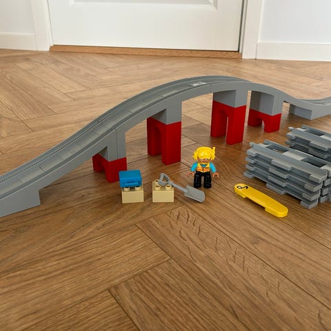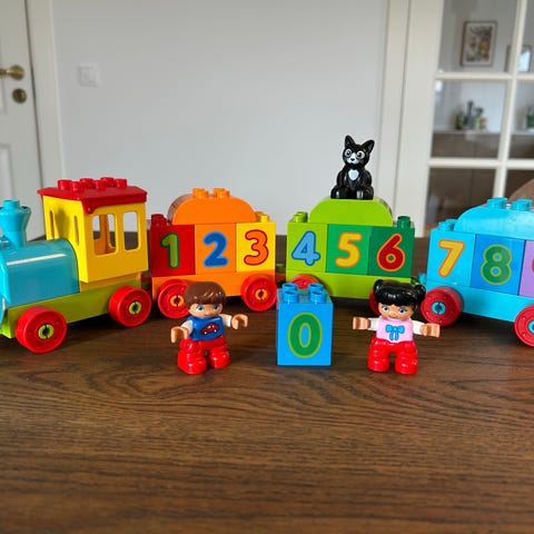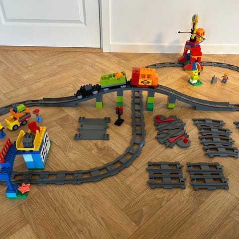LEGO DUPLO damptog togsæt med oval grå togbane, rød lokomotiv med vogne samt station med ur og billetautomat. Sættet indeholder desuden figurer, træ, tipvogn og tilbehør til leg omkring togstationen. Egnet til mindre børn, der leger med tog og byggesæt i store DUPLO-klodser.