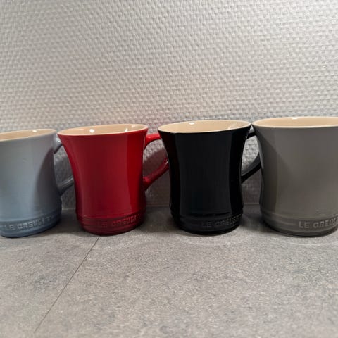 Le Creuset krus i cremefarvet stentøj. Krusene har hank og karakteristiske riller nederst på ydersiden. Velegnet til varme og kolde drikke i køkken og hverdag. Kan typisk bruges i ovn, mikroovn, fryser og opvaskemaskine efter producentens anvisninger.