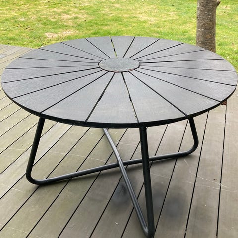 Rundt havebord i sort aluminiumsstel med sorte non-Wood lameller og marmor i midten.