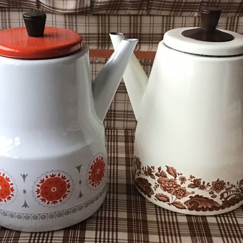 Emalje, Kaffekande, Retro kande, Maljekande – retromønster hvid blå Ø 13 x 21 cm.