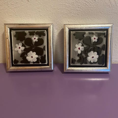 Vægdekoration bestående af tre firkantede billeder med blomster motiver i vaser. Billederne er indrammet i ens, profilerede guldfarvede rammer. 25x25 cm. Motiverne viser forskellige blomsterarrangementer i lyse nuancer. Handmade G & C interiørs. Egnet som vægpynt i fx stue, soveværelse eller gang. Kan hænges samlet som sæt eller hver for sig.
