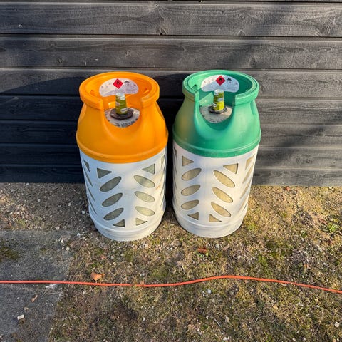 2 x 5l Gasflasker til gas (tomme). To gasflasker i forskellig udførelse, en kompositflaske med blå top og en metalflaske i gul/orange. Velegnet til brug, hvor der er behov for gas, f.eks. til grill, varmeapparater eller lignende udstyr, der anvender gasflasker som energikilde.