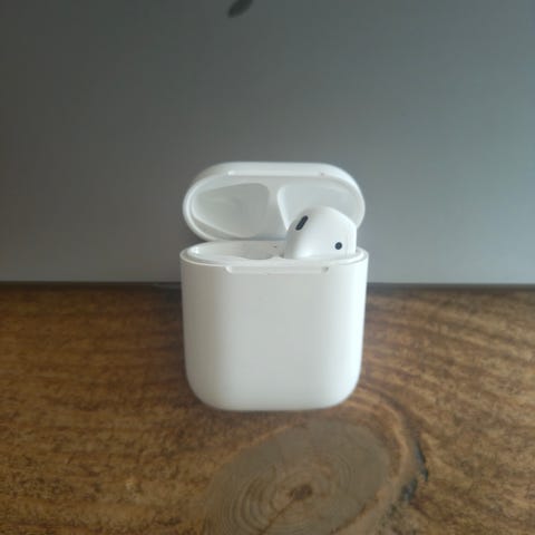AirPods 2 med trådløs opladning. Den højre øreprop holder i 25-30 minutter. De aflades meget hurtigt under opkald. De fungerer som et ekstra par ørepropper.