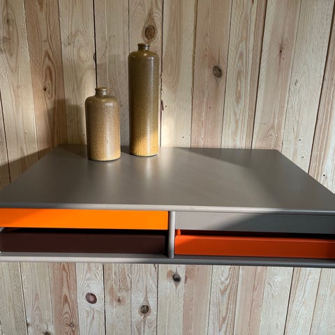 Montana væghængt skuffemodul i farven coffee med creme/ røde bakker.. modulet måler 47x69,5 cm og er med ophængslister