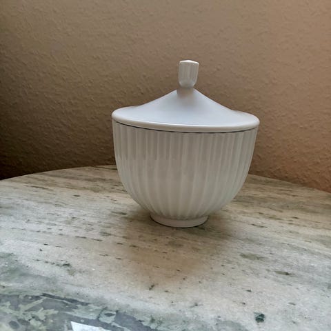 Hvid porcelæns Bonbonniere fra Lyngby. Diameter 10 cm - det er den lille af de to på sidste billede.